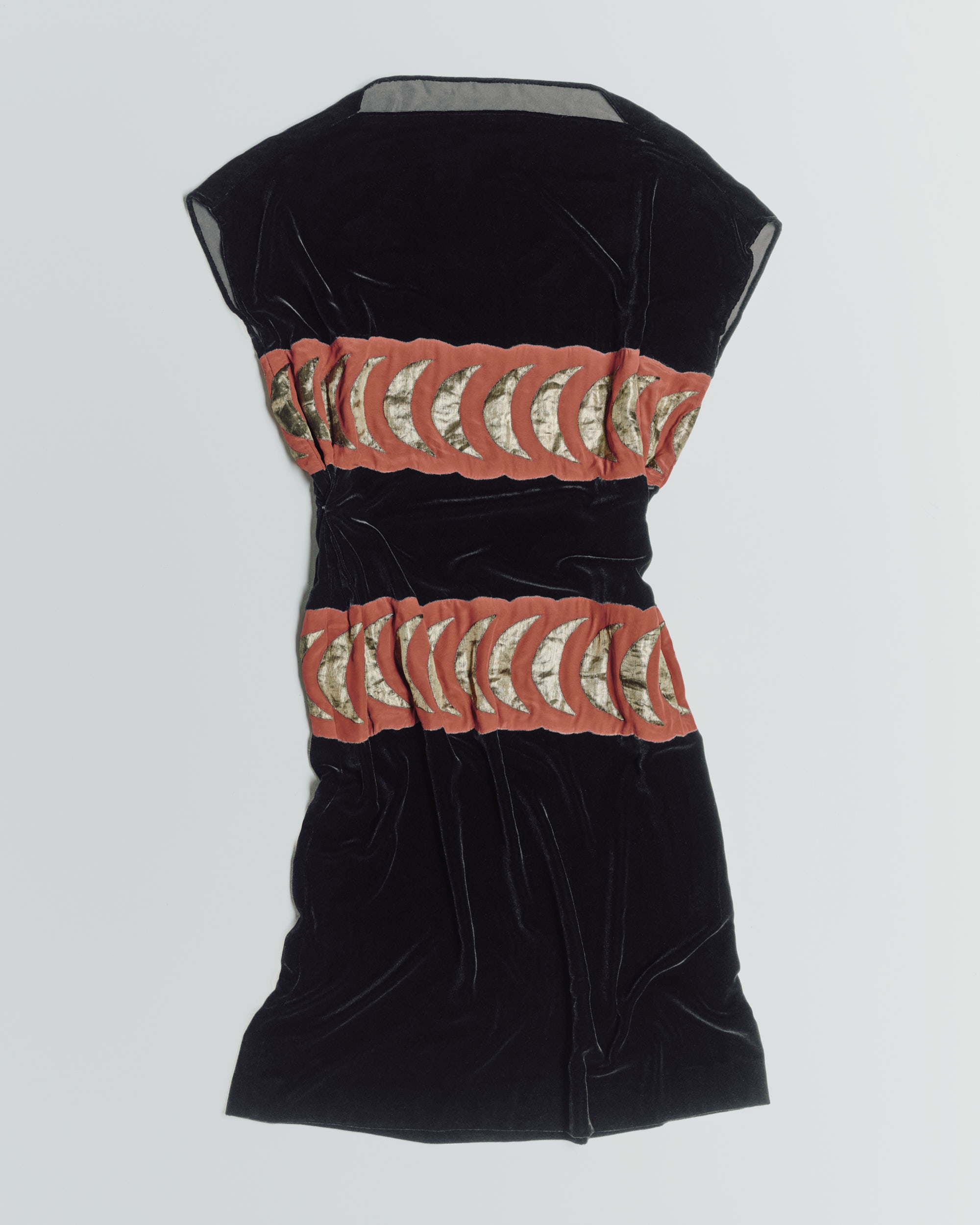Bands on scalloped coral crêpe de Chine arc across the surface like astral ribbons, while lamé crescents glint with quiet, devotional insistence. Byzantine in their iconography, surreal in their logic, these motifs anticipate Schiaparelli’s symbolic couture by nearly a decade.